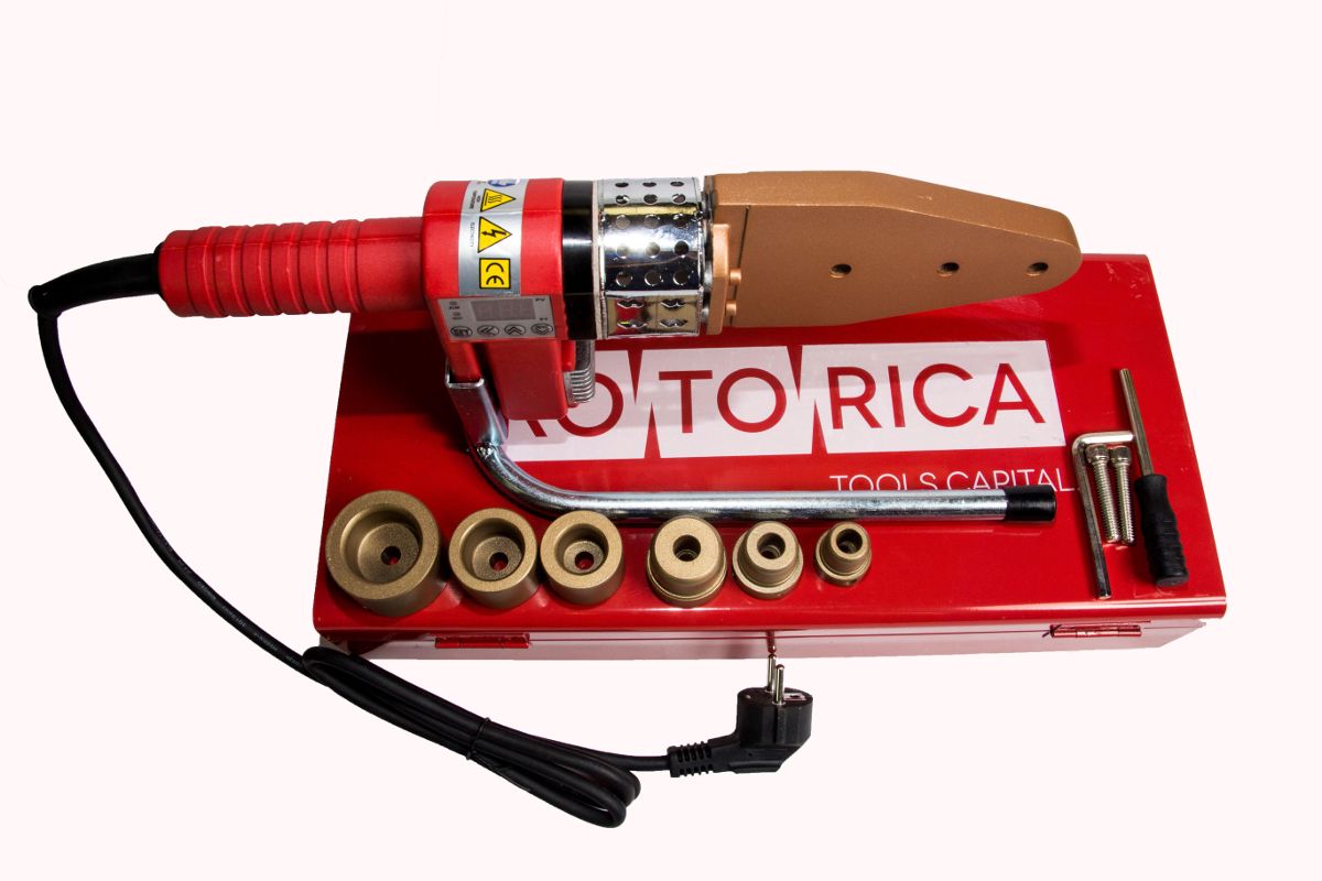 Компактный и удобный паяльник для сварки враструб труб и фасонных деталей из ПЭ, ПП, ПВДФ и ПБ диаметром от 16мм до 40мм, с электронной регулировкой температуры, с двумя отверстиями для крепления дорнов и муфт.